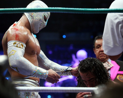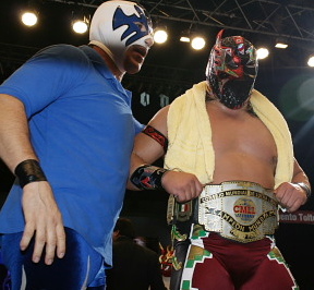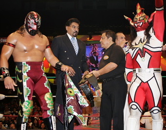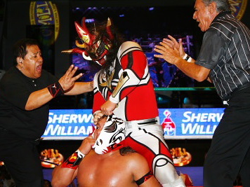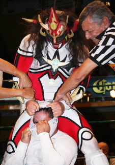 うーん、ライガーにはもう少し先週のようにガンガン暴れてもらいたかった気がしますが、メキシコのタイトルマッチは権威が高くヘタなことすると即反則負けですから致し方なしですか。第15代王者が7度目の防衛に成功です。